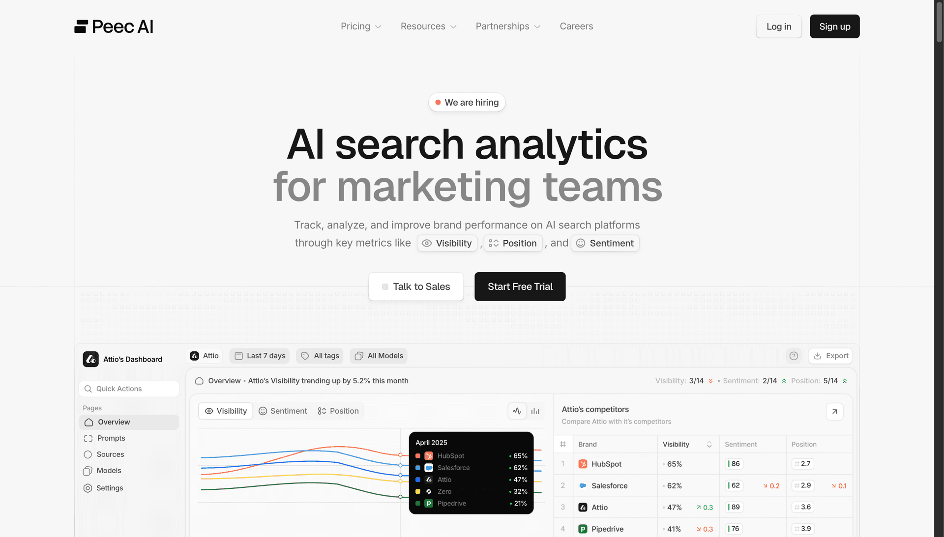 A 7-day free trial is available on all plans. Note that Peec is monitoring-only — no content creation features — so you'll need a separate content stack for acting on the data.