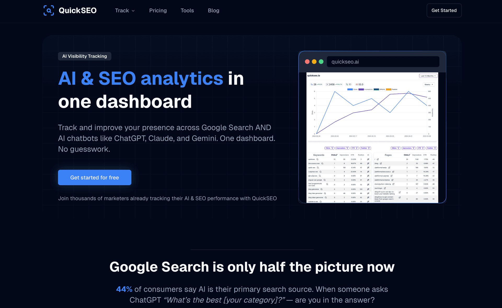 Most ChatGPT tracking tools exist in a vacuum — they show you AI visibility data but leave you switching between tabs to connect it with your actual search performance. QuickSEO bridges that gap by combining Google Search Console analytics with AI visibility tracking across ChatGPT, Claude, Gemini, and Perplexity in a single dashboard.