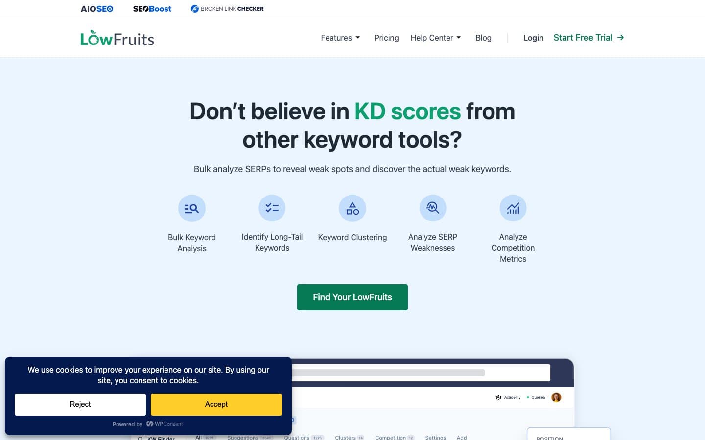 LowFruits is built specifically for finding low-competition keywords, which makes it a natural fit for programmatic SEO. It analyses SERPs in bulk and highlights keywords where weak domains (forums, user-generated content, thin pages) are ranking — meaning your template-generated pages have a realistic shot at outranking them. The SERP weakness analysis is the standout feature: instead of relying on estimated difficulty scores, it checks the actual top-10 results for each keyword.