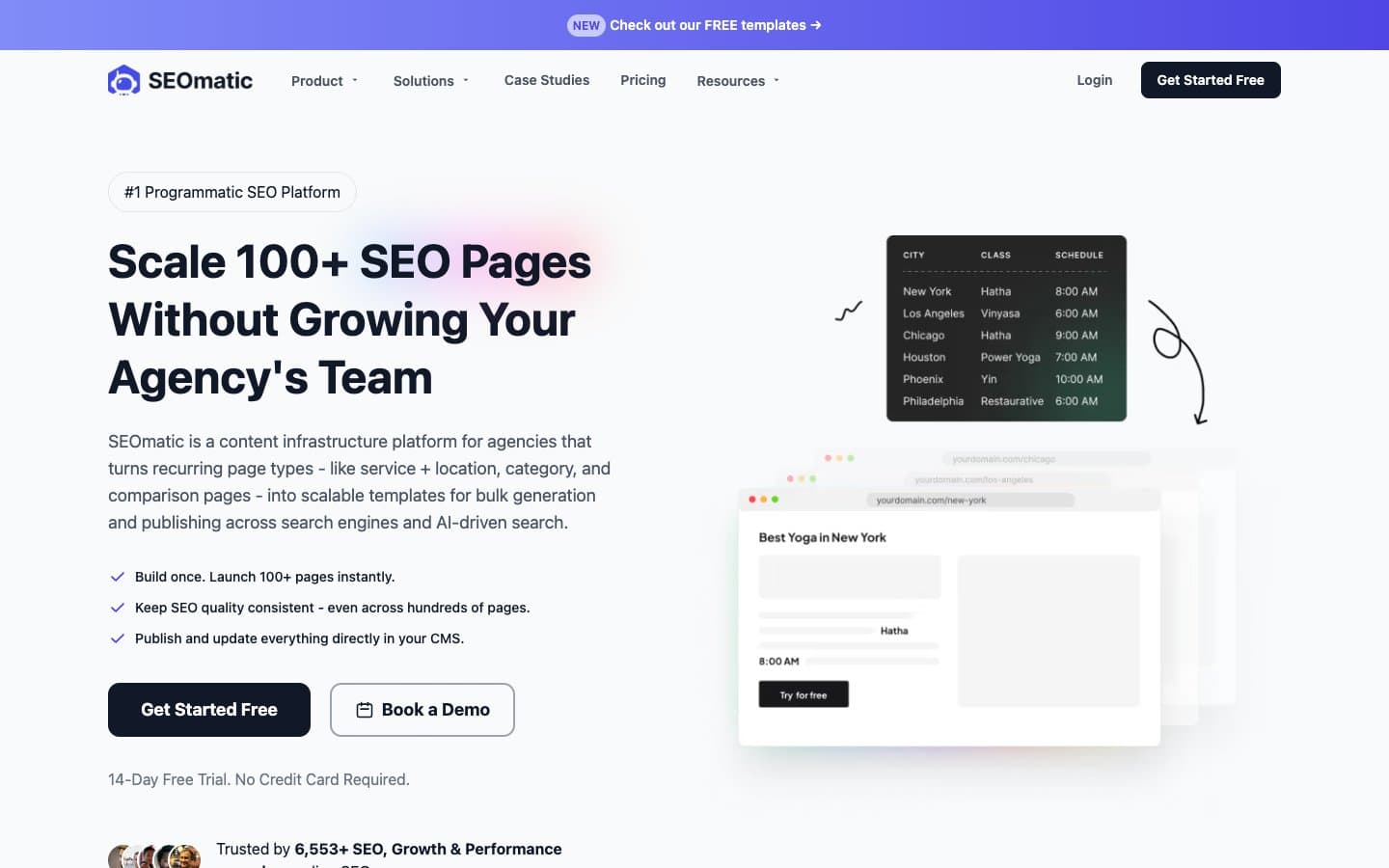 SEOmatic is the most established dedicated programmatic SEO platform. It’s designed specifically for agencies and teams that need to create recurring page types — service + location pages, category pages, comparison pages — at scale. You build a template once, connect your data source, and SEOmatic generates hundreds of pages with consistent SEO quality. It publishes directly to WordPress, Webflow, and other CMS platforms. The built-in AI writer helps paraphrase content across pages to avoid duplicate content issues.