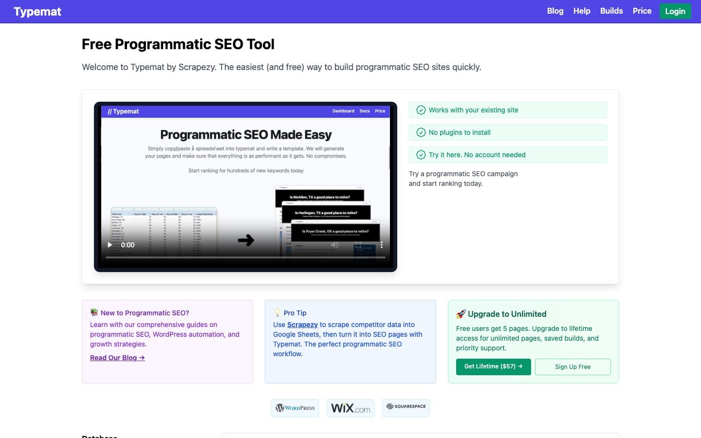 Typemat is the simplest and most affordable option for getting started with programmatic SEO. Paste a public Google Sheets URL, map your columns to template variables, and it generates pages you can import into WordPress, Wix, or Squarespace. There’s no account required to try it, and the free tier lets you create 5 pages. For small-scale pSEO experiments or quick prototyping, Typemat’s zero-friction approach is hard to beat.