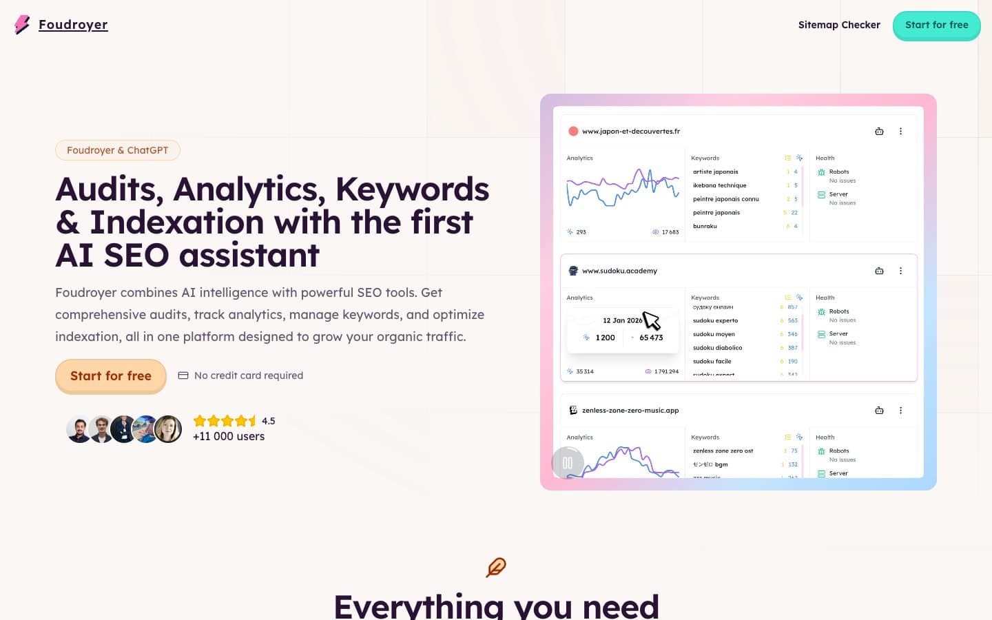 Foudroyer is an indexing-focused tool that combines Google Search Console integration with automated indexing requests. It monitors which of your pages are indexed, identifies issues preventing indexing, and can submit pages for crawling in bulk. For programmatic SEO sites where new pages are being added continuously, this kind of automated indexing management saves significant manual effort.