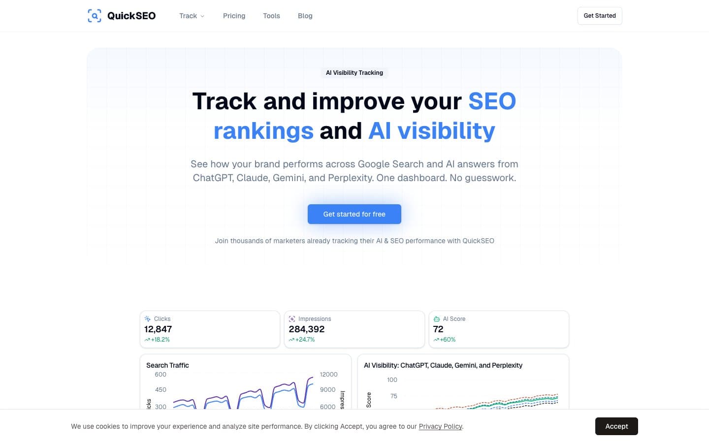 QuickSEO connects your Google Search Console data with AI visibility tracking across ChatGPT, Claude, Gemini, and Perplexity in a single dashboard. You can see exactly which of your pages and keywords are driving traffic from Google, and separately track whether your brand is appearing in AI-generated answers to the same queries. This “GSC-to-AI gap” view is particularly valuable for programmatic SEO: it shows you which of your template page types are working in traditional search versus AI search, so you know where to invest in content improvements.